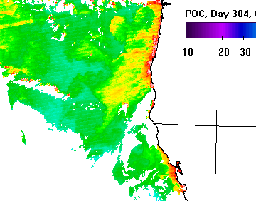 The standard NASA POC algorithm (Stramski et al 2008) is sensitive to errors in Rrs that are common along cloud edges (see below). These errors