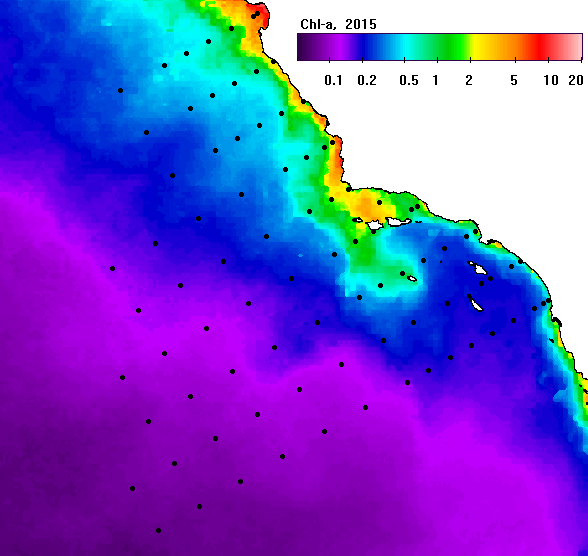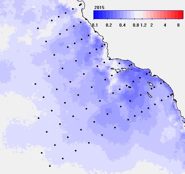 For each cruise we can calculate the Mean Chla composite for the observation period (e.g. , 28-Mar-2015 to 26-Apr-2015 for cruise 201502), the interannual Mean for the same time period (e.g. 28-Mar to 26-Apr) over all available years, and the ratio of the current period mean to the longterm mean. The ratio to the longterm Mean is uased as a measure of the anomaly. These datasets in both HDF4 and PNG formats are zipped and available for downloading in the Table below.