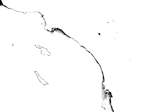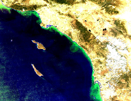 “Standard” ocean color products such as chlorophyll-a concentration (Chl-a, e.g. O’Reilly et al., 1998) are not specific to HABs but are useful for detecting very high Chl-a levels that are often associated with HABs. For example, the very high Chl-a in the Santa Barbara channel (SBC) in Figures 1 and 2 may be or may not be not associated with toxic blooms. The bloom in Fig. 2 was most likely dominated by a toxic diatom Pseudo-nitzschia. Similar blooms in SBC were described in Anderson et al (in press) and were associated with significant marine mammal deaths in 2003.