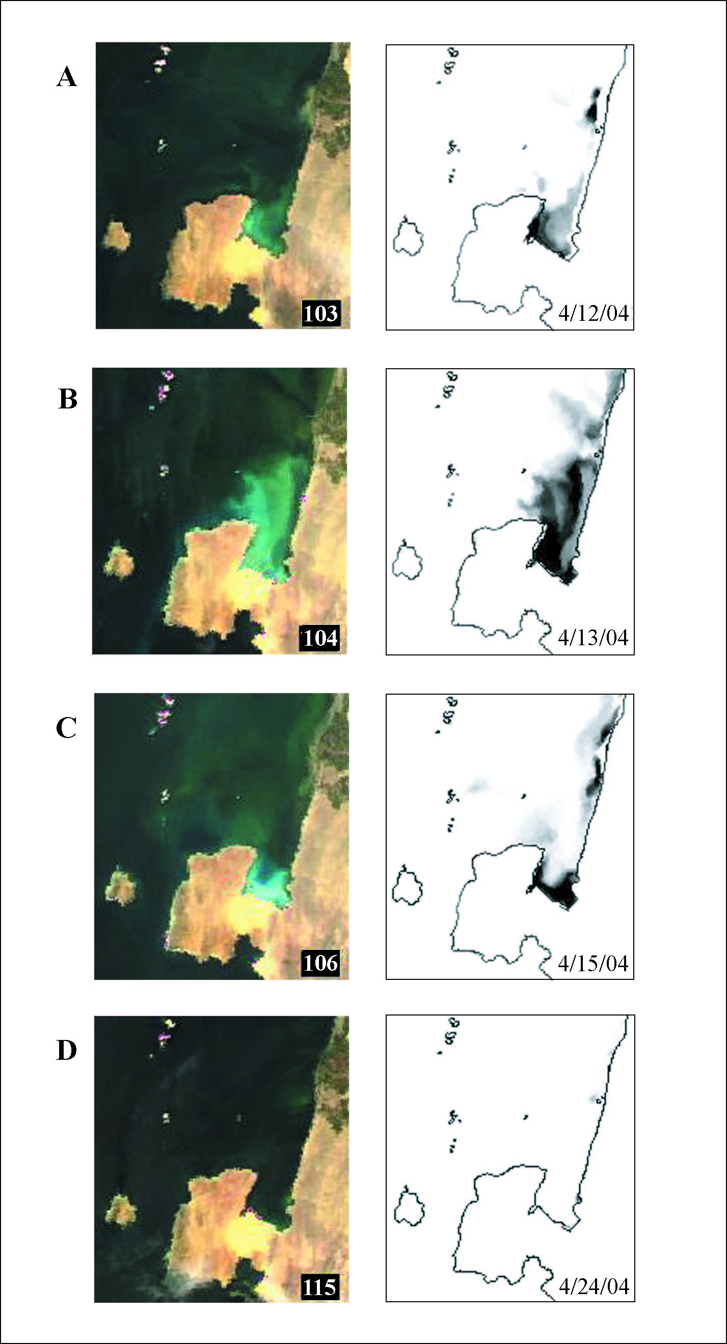 (B) Turbidity using the MODIS 250 m bands (Kahru et al., 2004). For a full-resolution version click on the image or here. |