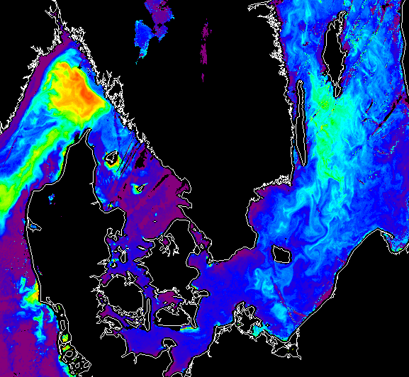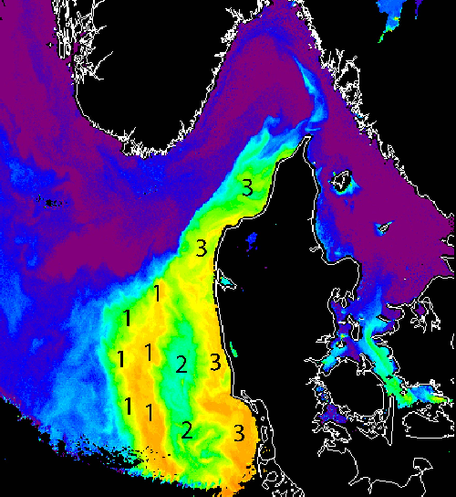 result of the previous image: coccolithophore bloom shown in black and the Nodularia bloom in dark gray.